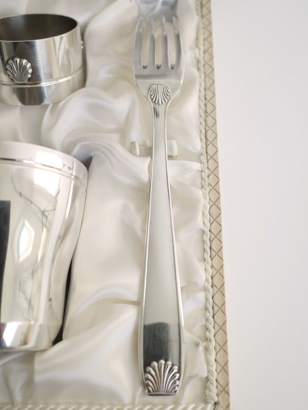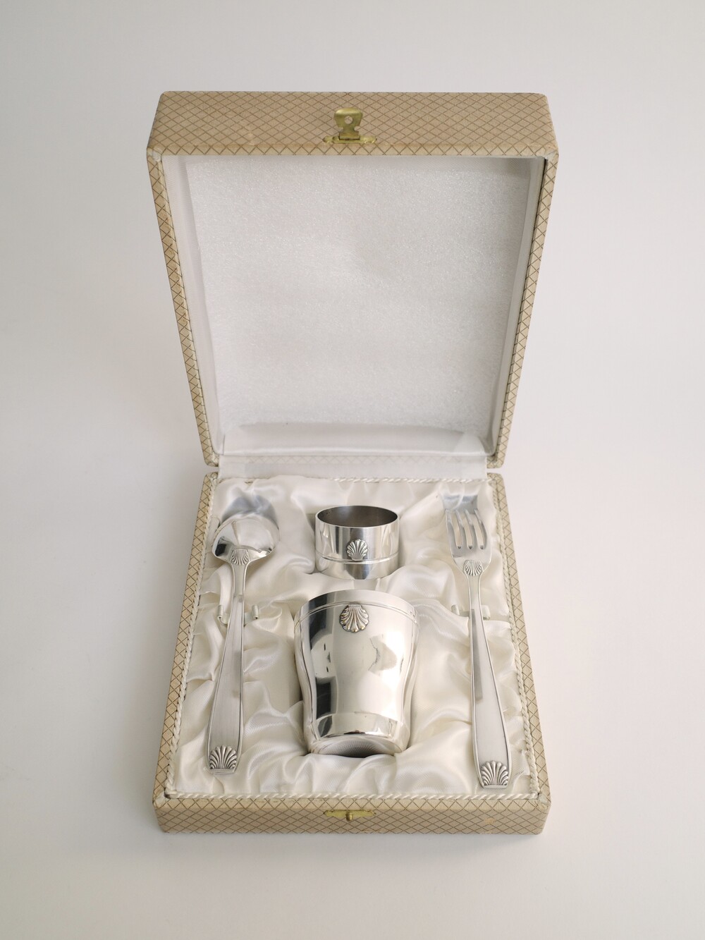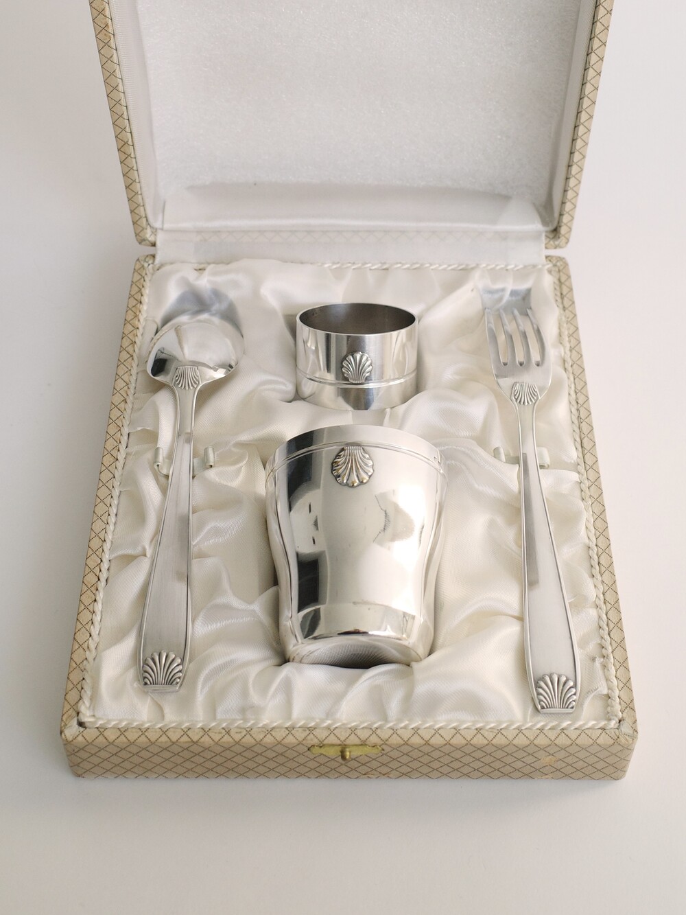 Art Deco Silver-Plated Cutlery and Cup Set by Stéphane Prudhomme, with Original Box, France (c. 1920s–1930s)