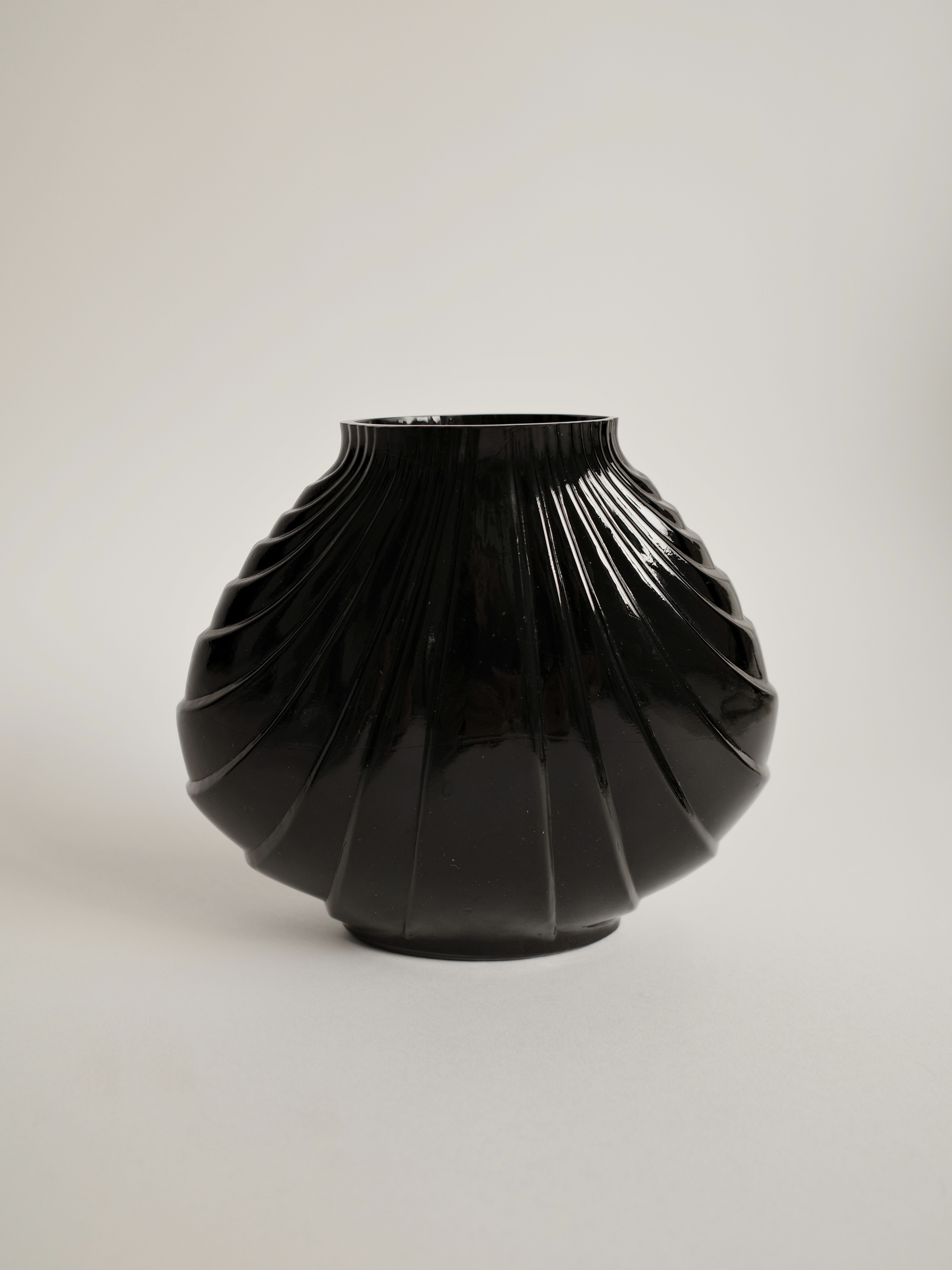 Vintage Black Art Deco Hand-Blown Pleated Glass Vase in Clam Shell Form, France (1980s)